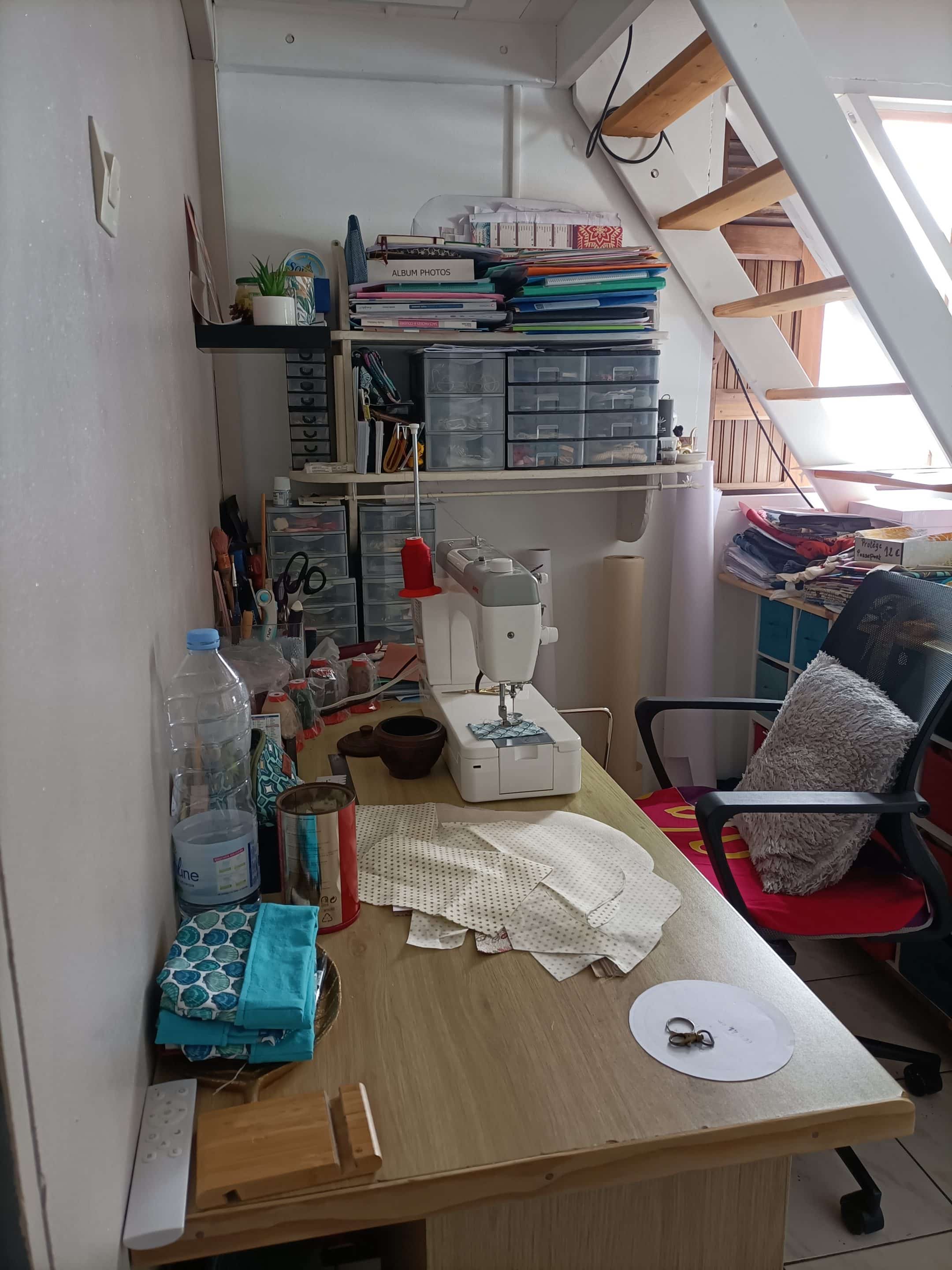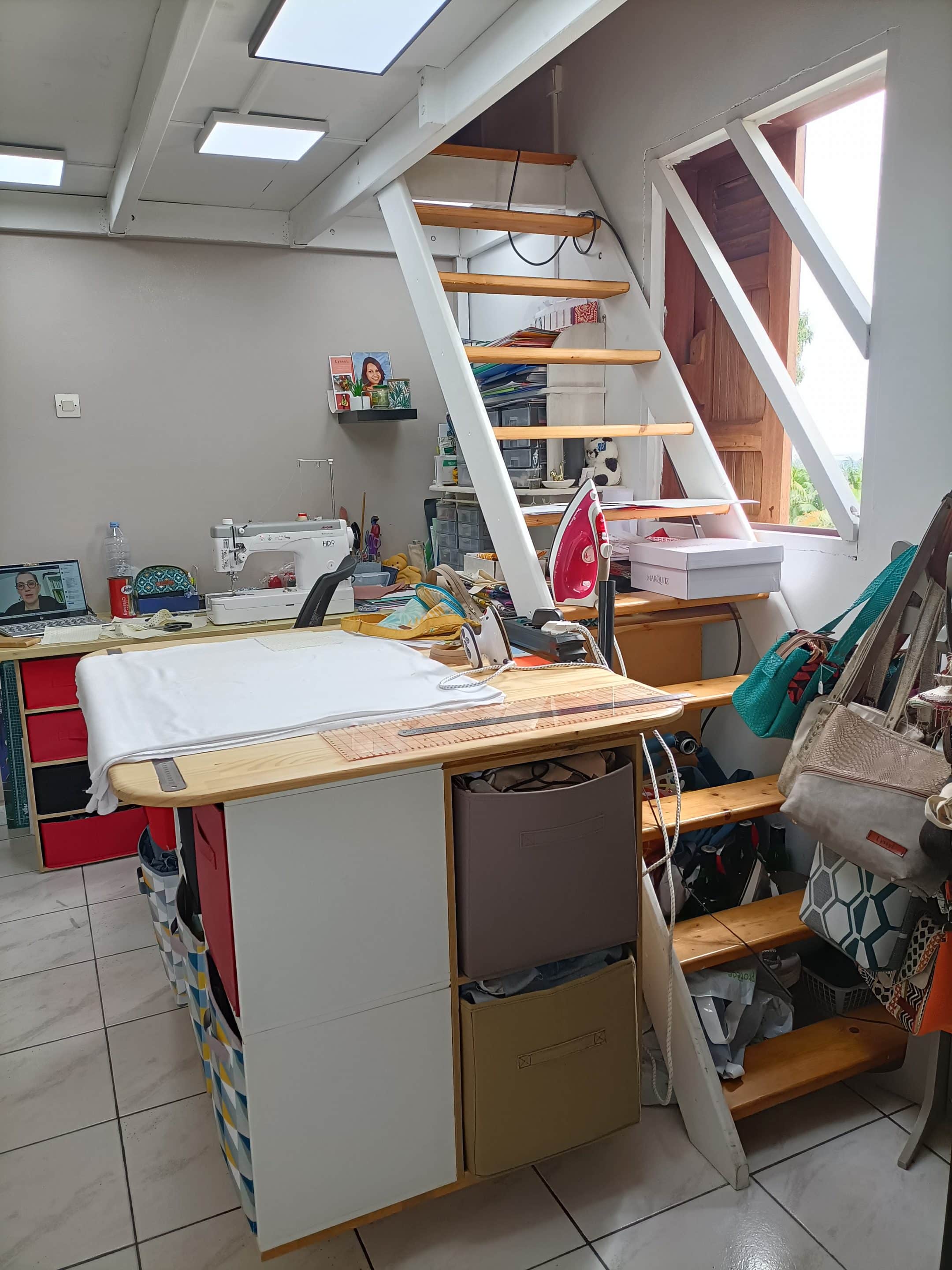 Cette pièce de notre maison a été entièrement refaite par mon mari, sur mesure, pour y installer mon Atelier.