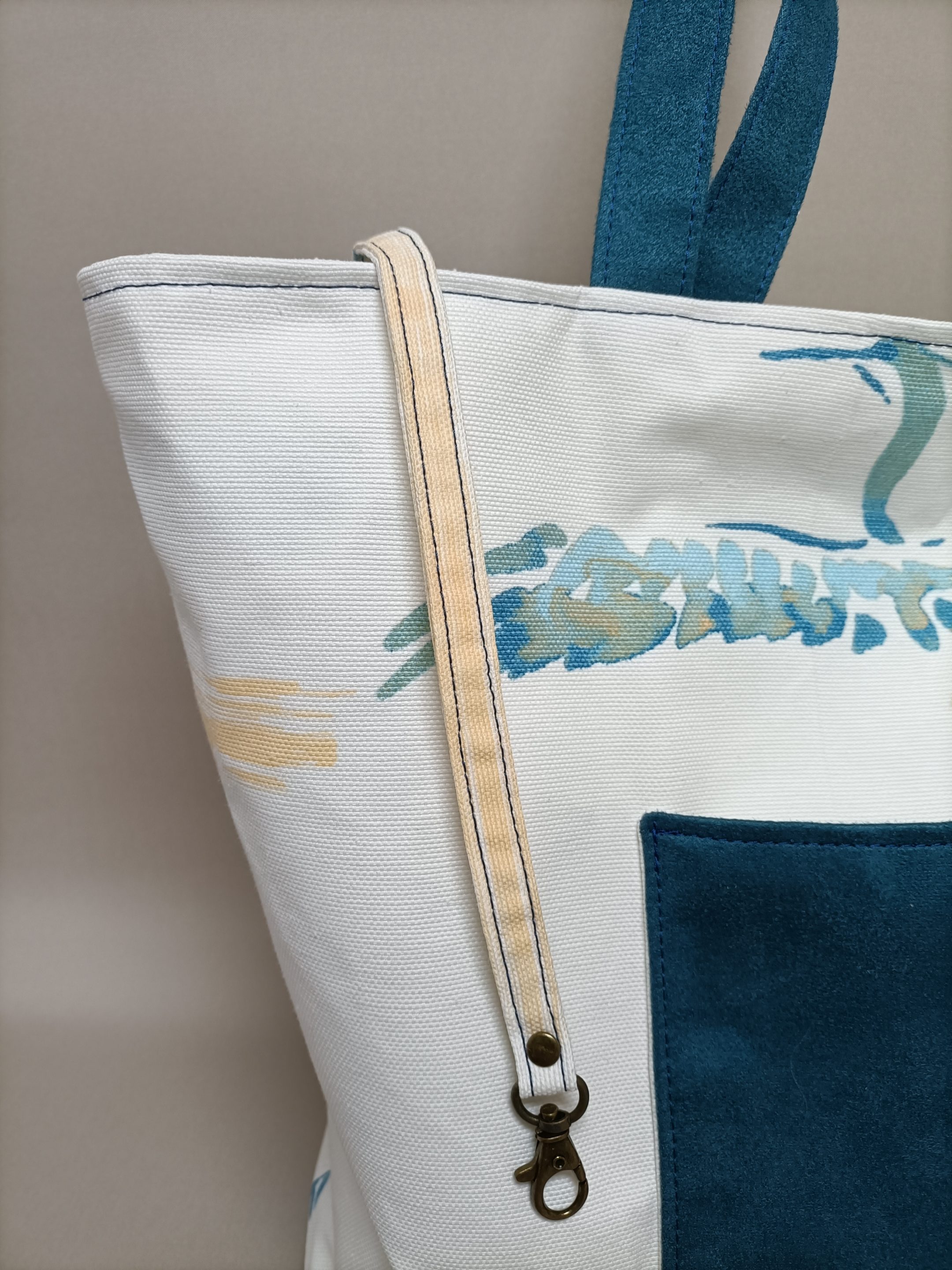 On retrouve à l’intérieur du grand sac cabas aigrette le cordon et son mousqueton bien pratique pour y accrocher les clés en toute sécurité.