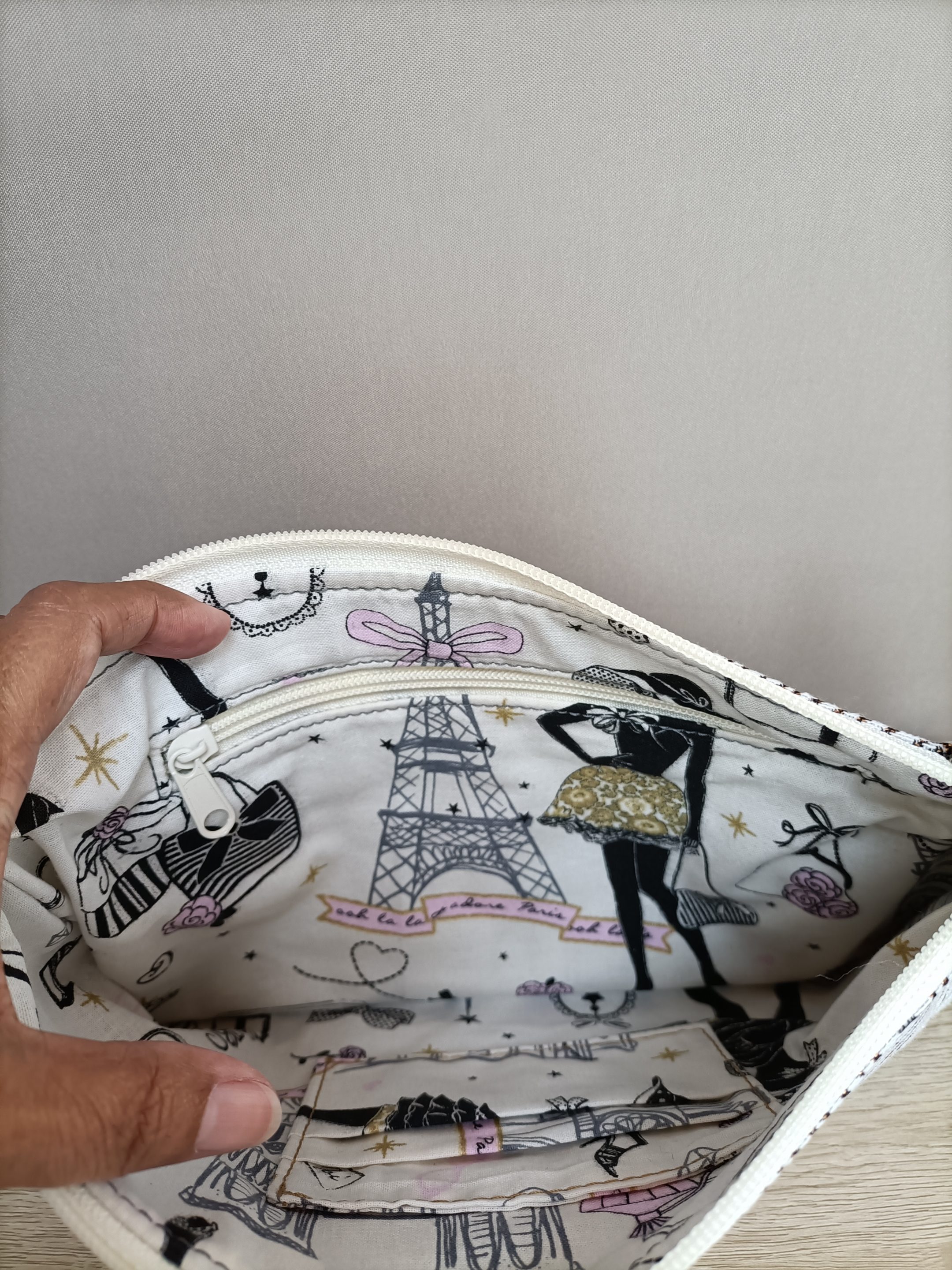 La pochette a une bandoulière réglable avec deux mousquetons pour pouvoir l’utilisée seule en trousse dans votre sac. Toutes vos affaires seront bien à l’abri grâce à la fermeture par glissière de cette pochette.