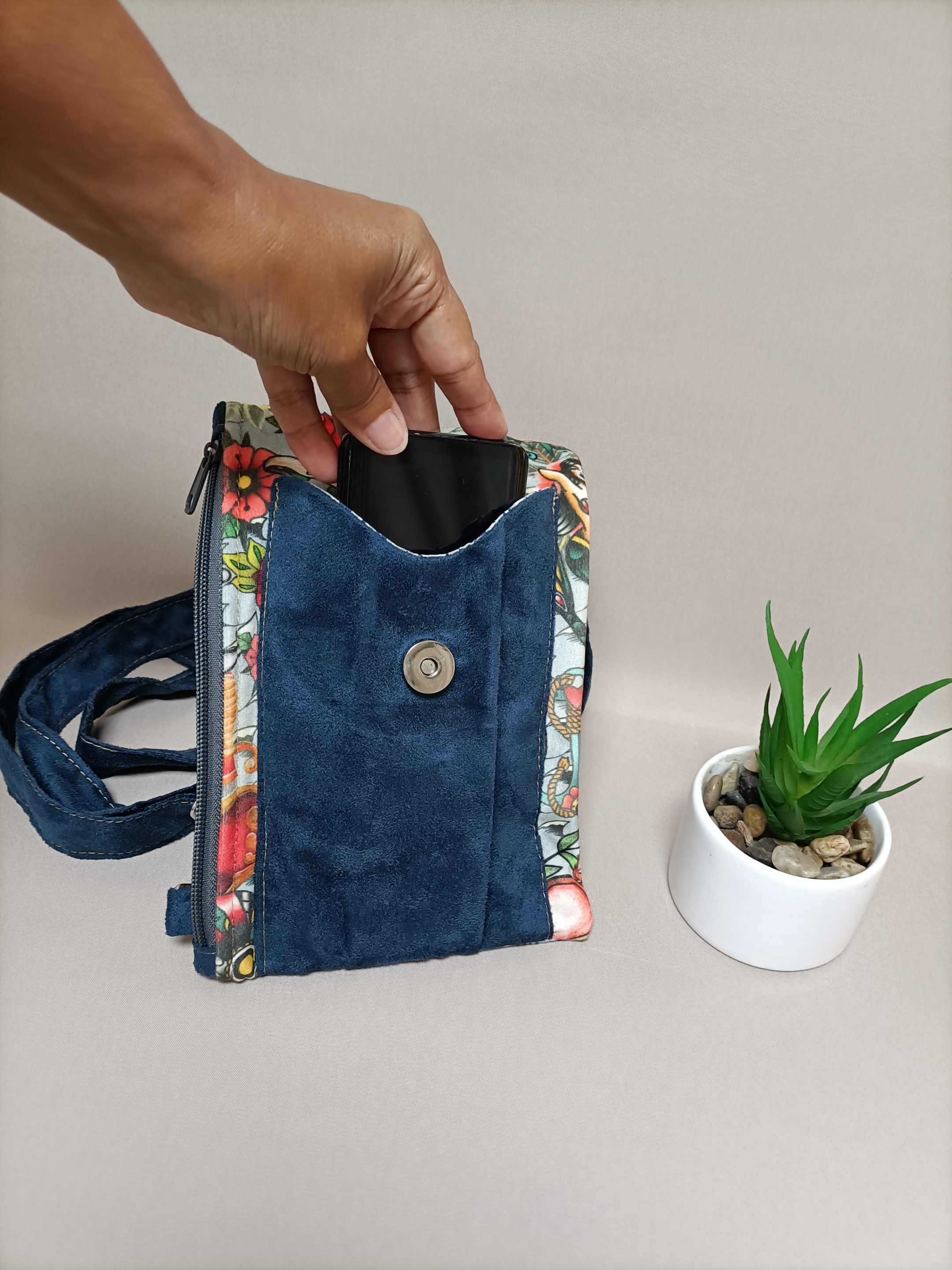est une pochette que vous pouvez porter en toutes occasions. Elle peut être porter toute l’année, grâce à ses couleurs et à sa forme intemporel. Le mélange des matières suédine et velours est en parfait accord avec ce modèle. La pochette est de forme rectangulaire. Elle est suffisamment spacieuse pour loger votre téléphone, vos clés, paquet de mouchoir, quelques documents etc…Cerise sur le gâteau, cette pochette a un porte carte dans la doublure intérieur. Avec la pochette téléphone, vous restez à la pointe de la modernité tout en affichant votre style avec un modèle unique qui vous ressemble. Choisissez le Sac Cabas toucan pour un total look, les couleurs sont assortis à ce modèle.