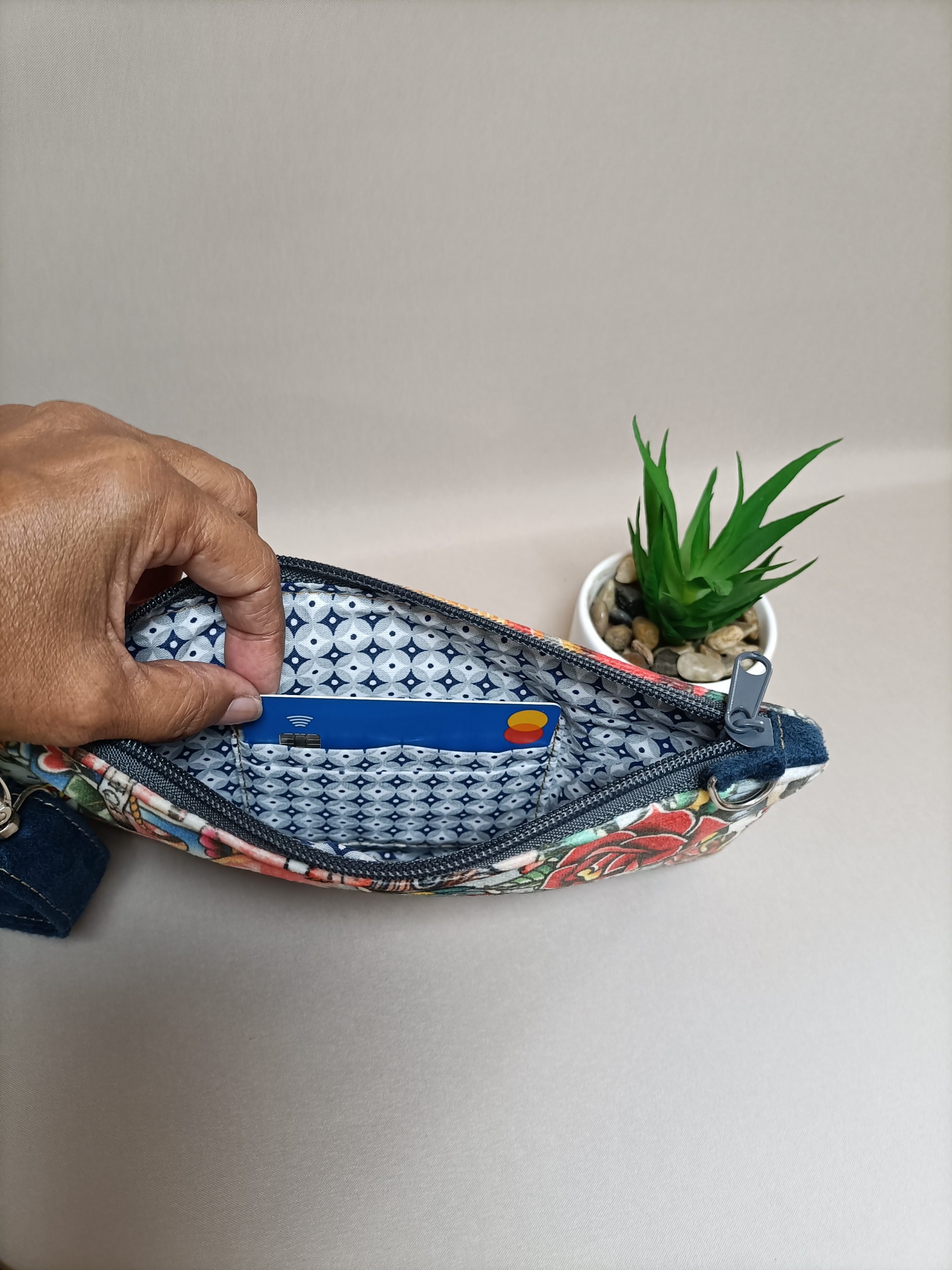 La pochette a une bandoulière réglable avec trois mousquetons pour pouvoir l’utilisée en bandoulière, au coup ou en banane. Sans la bandoulière elle vous sers de trousse dans votre sac. La pochette se ferme sur le côté par une glissière afin d’avoir toutes vos affaires en sécurités.
