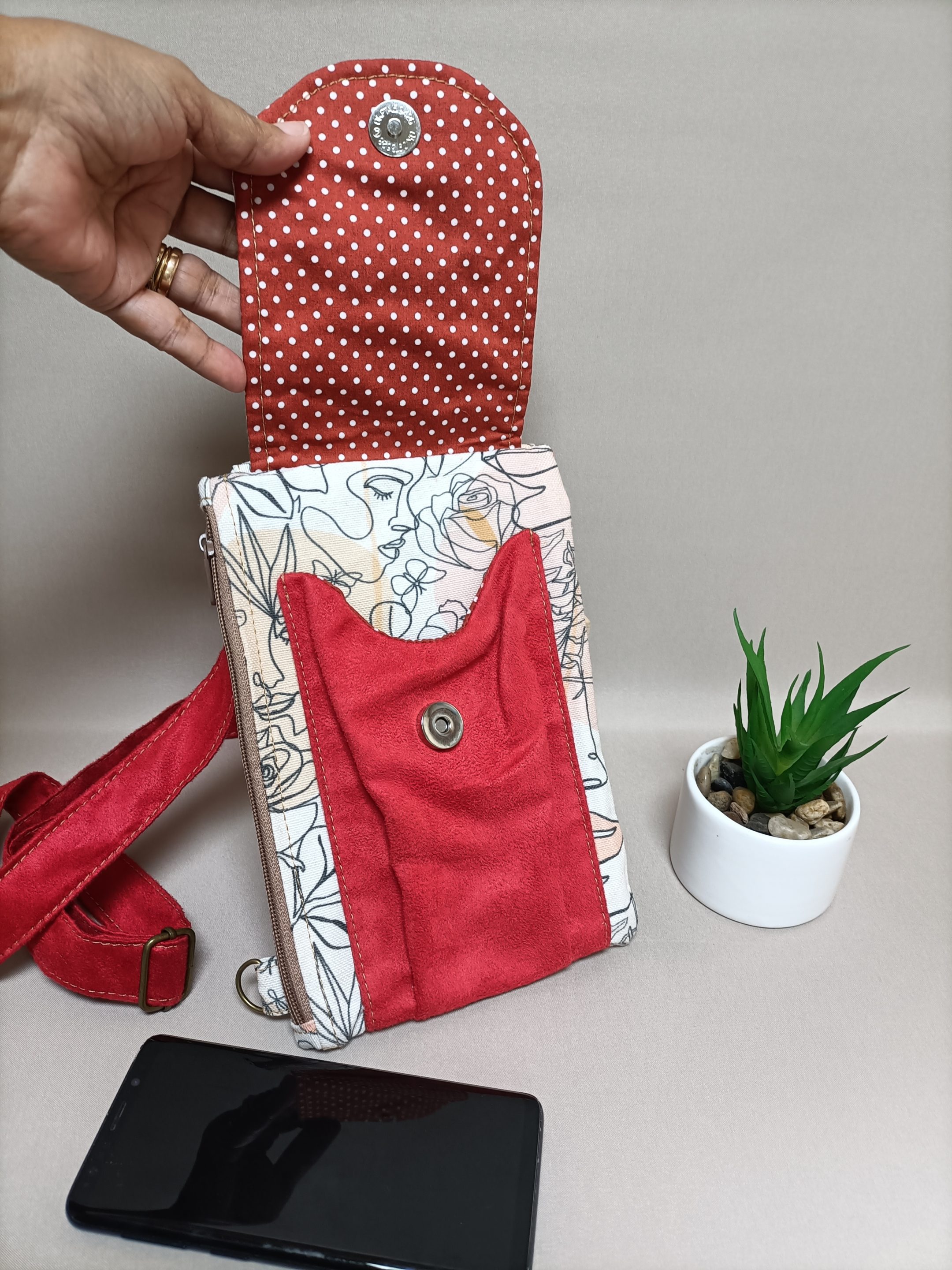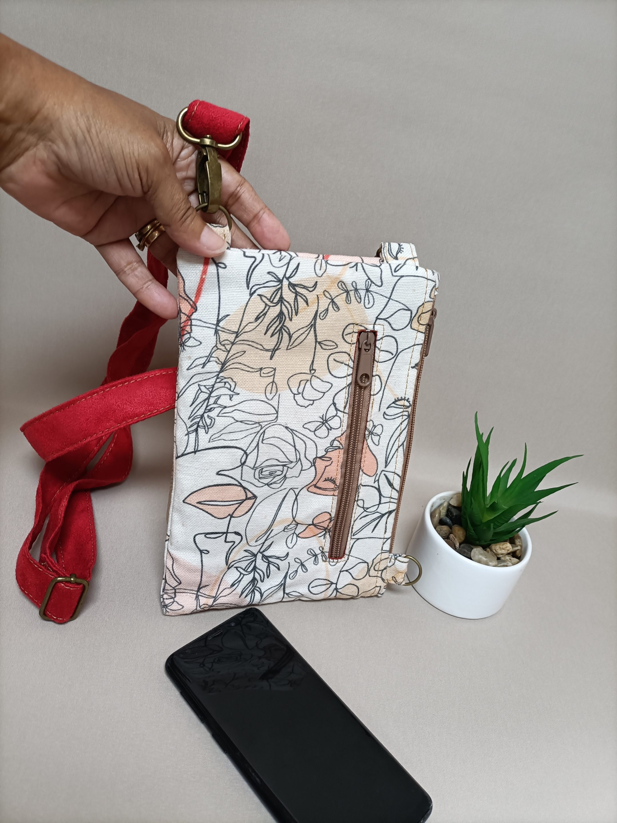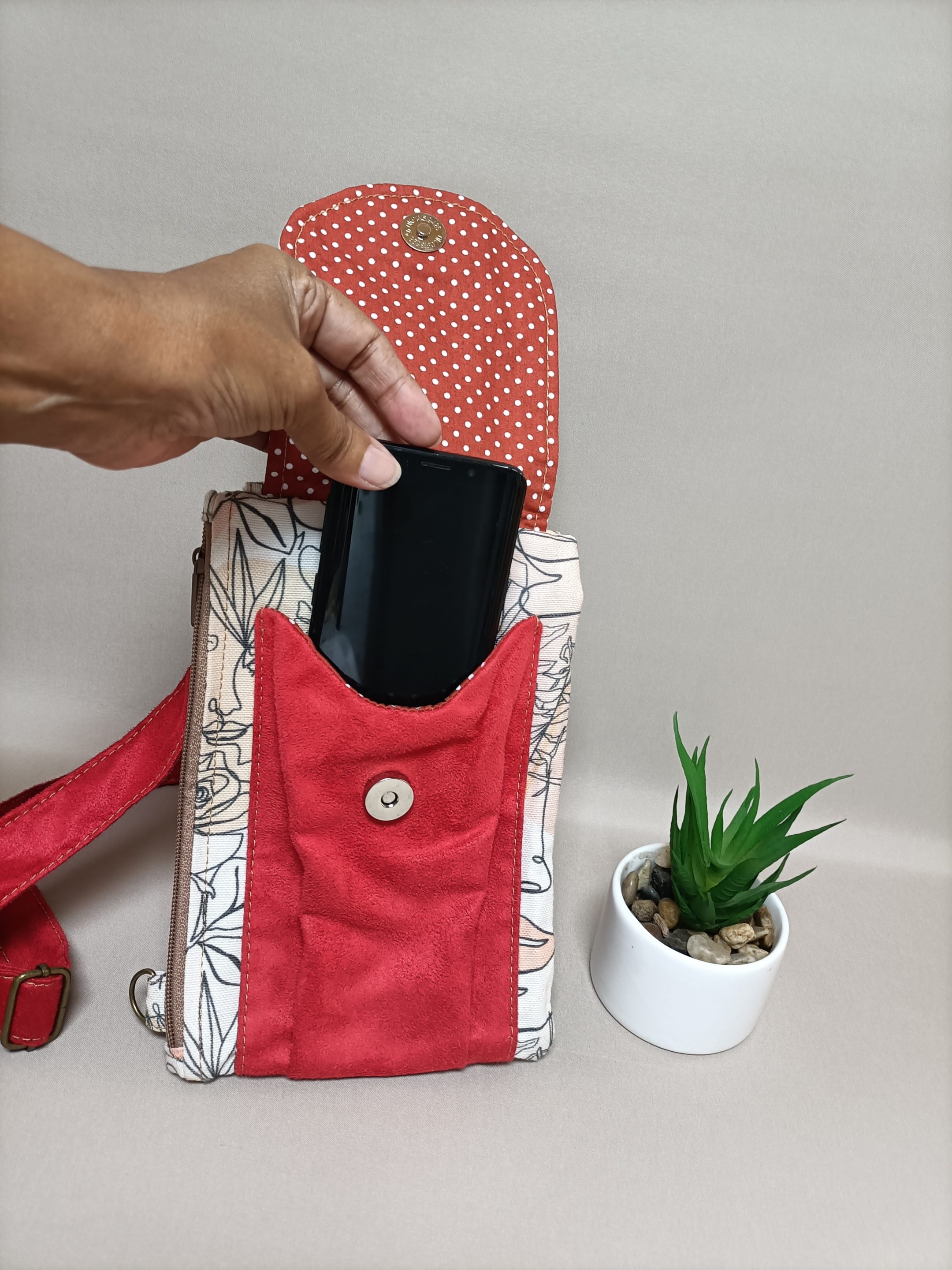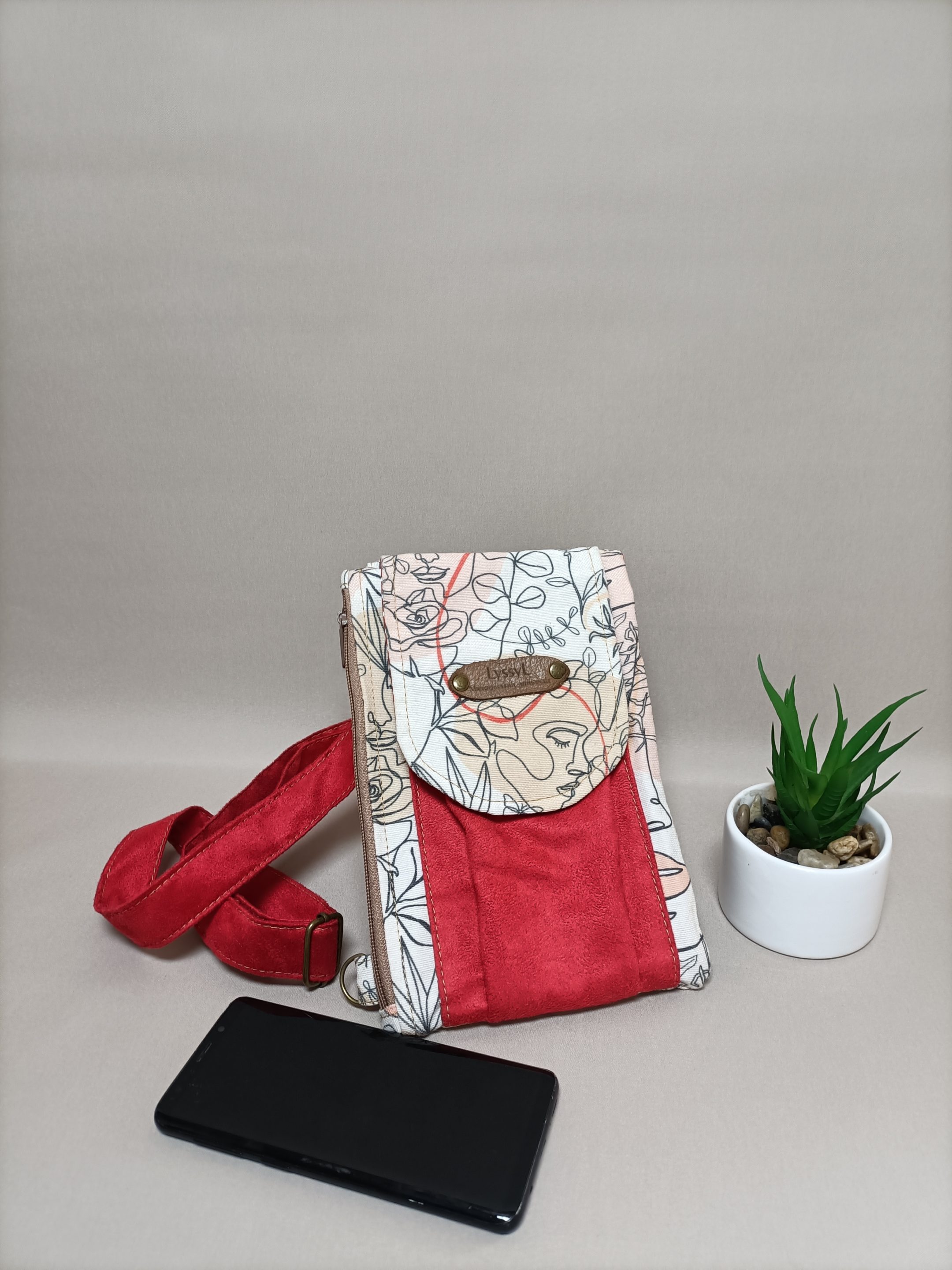 La pochette a une bandoulière réglable avec trois mousquetons pour pouvoir l’utilisée en bandoulière, au coup ou en banane. Sans la bandoulière elle vous sers de trousse dans votre sac. La pochette se ferme sur le côté par une glissière afin d’avoir toutes vos affaires en sécurités.