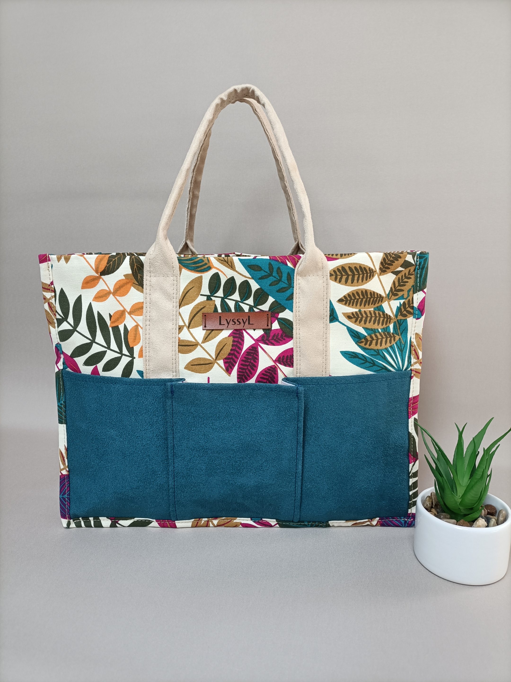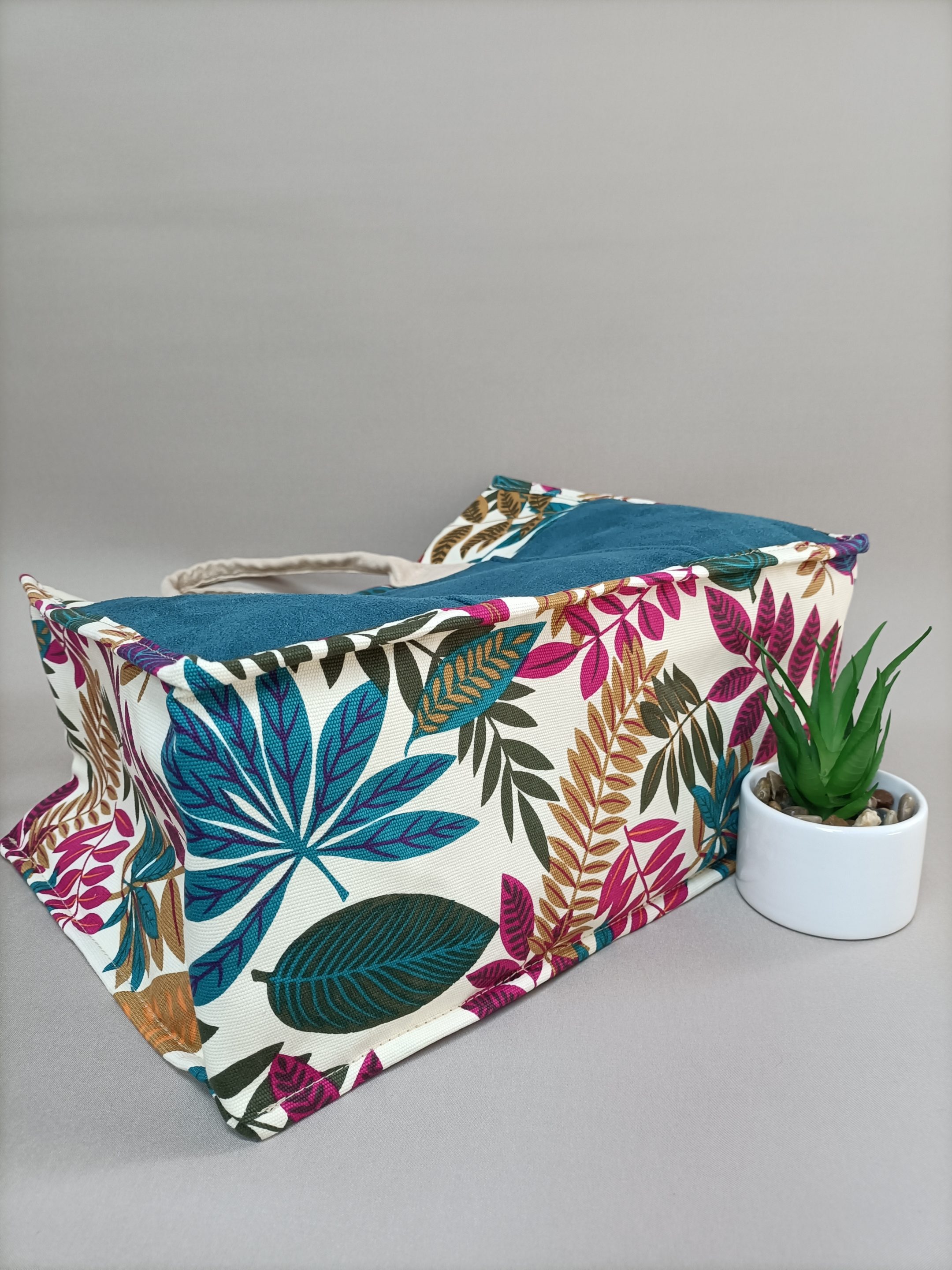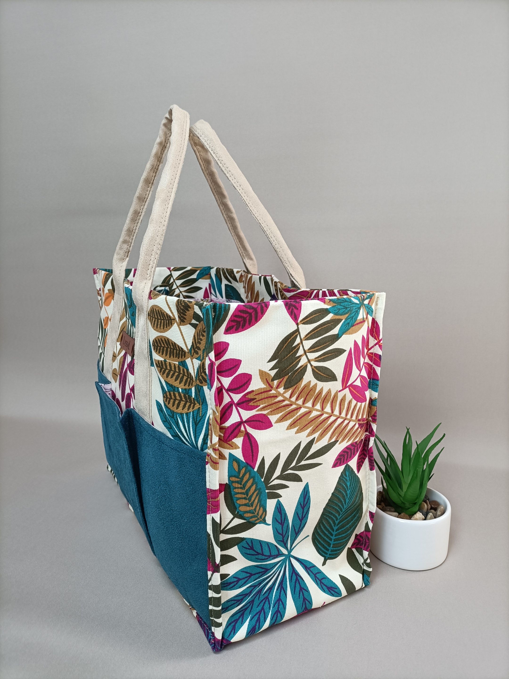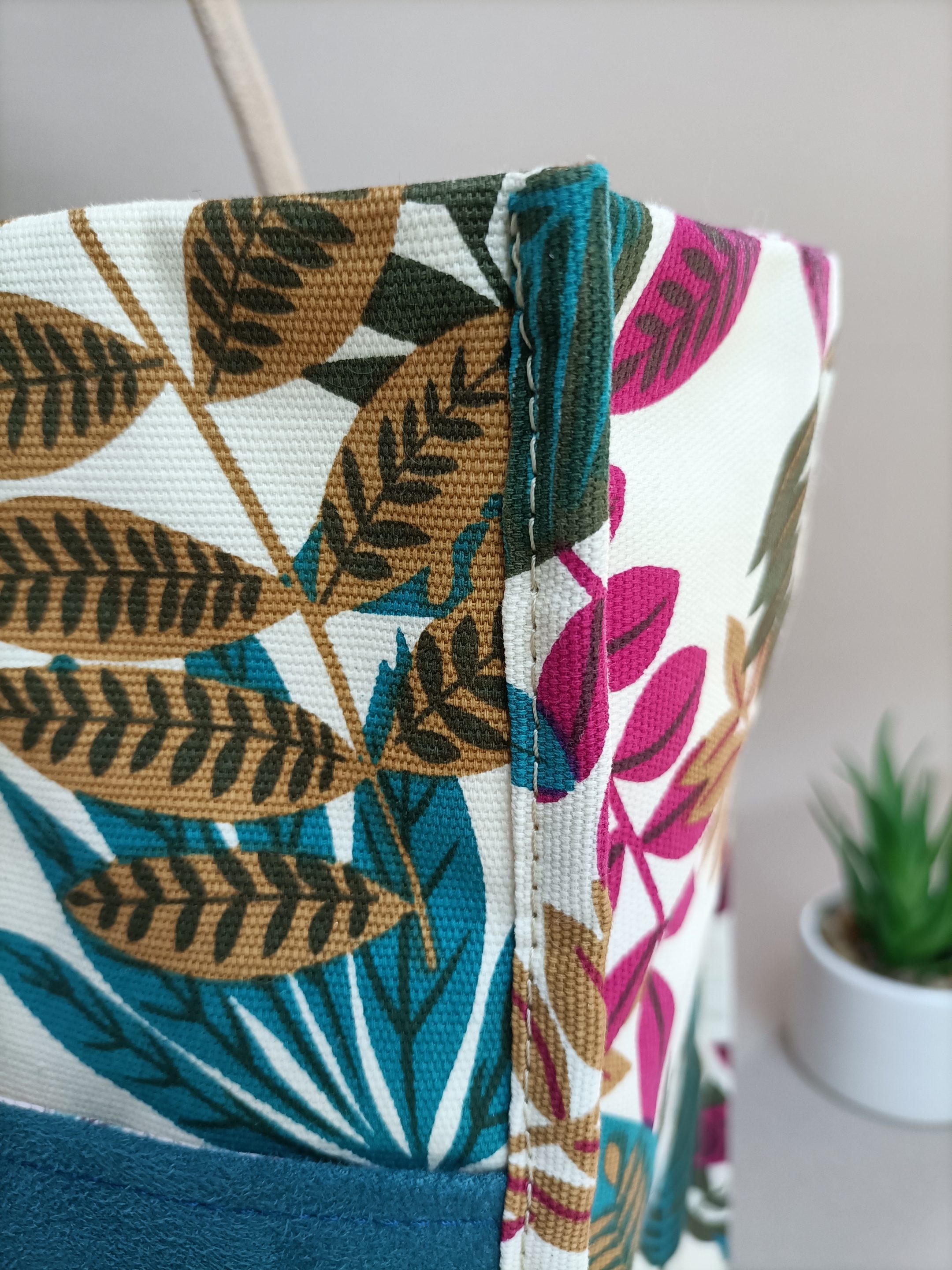 Le cabas Mille feuilles a deux anses en suédine très confortables. Il n’a aucune poches intérieur volontairement car j’ai voulu garder le côté cabas fourre tout. Si besoin, une trousse assortie peut compléter le sac et/ou La pochette téléphone qui peut servir de trousse en enlevant la bandoulière.