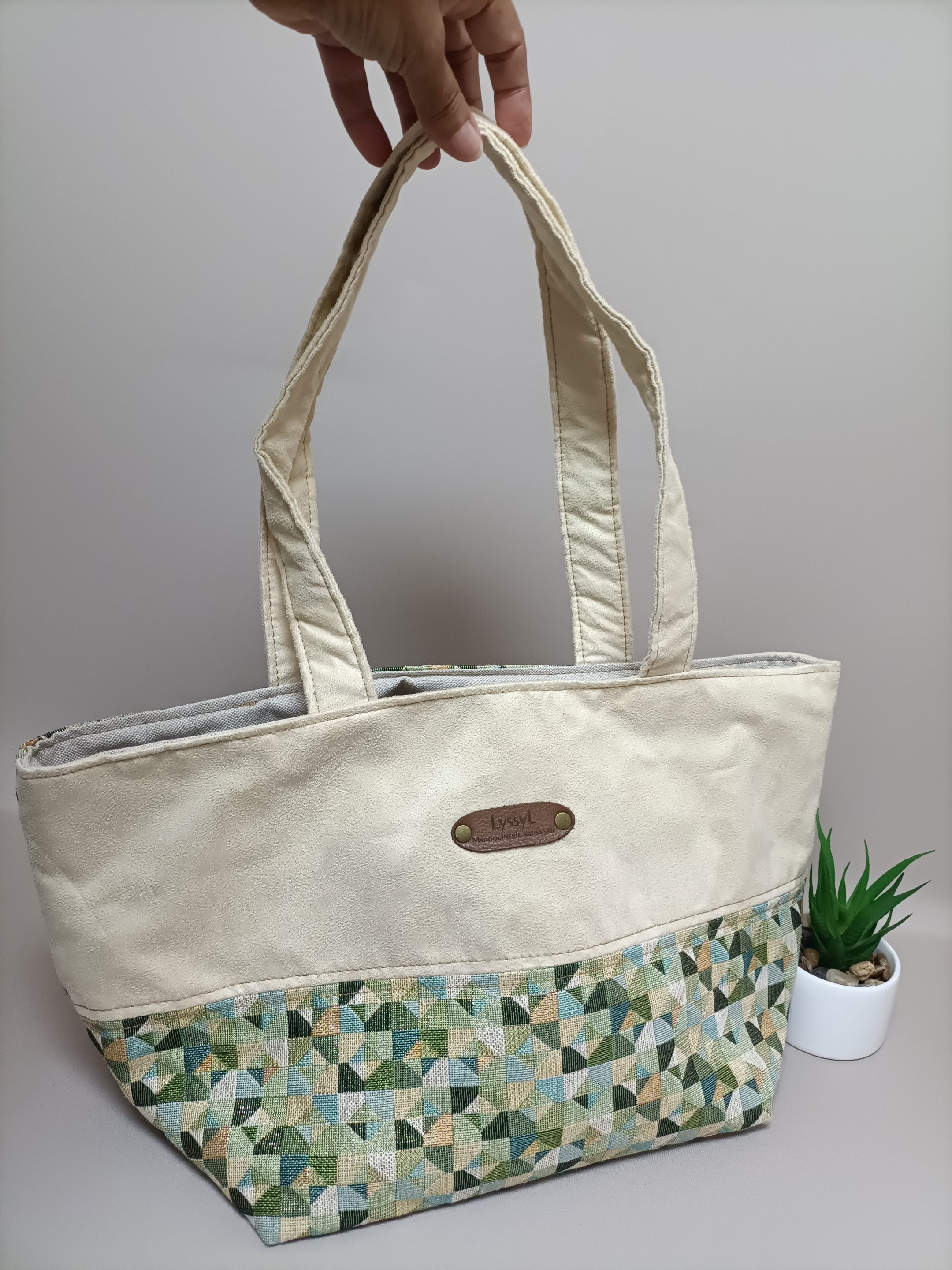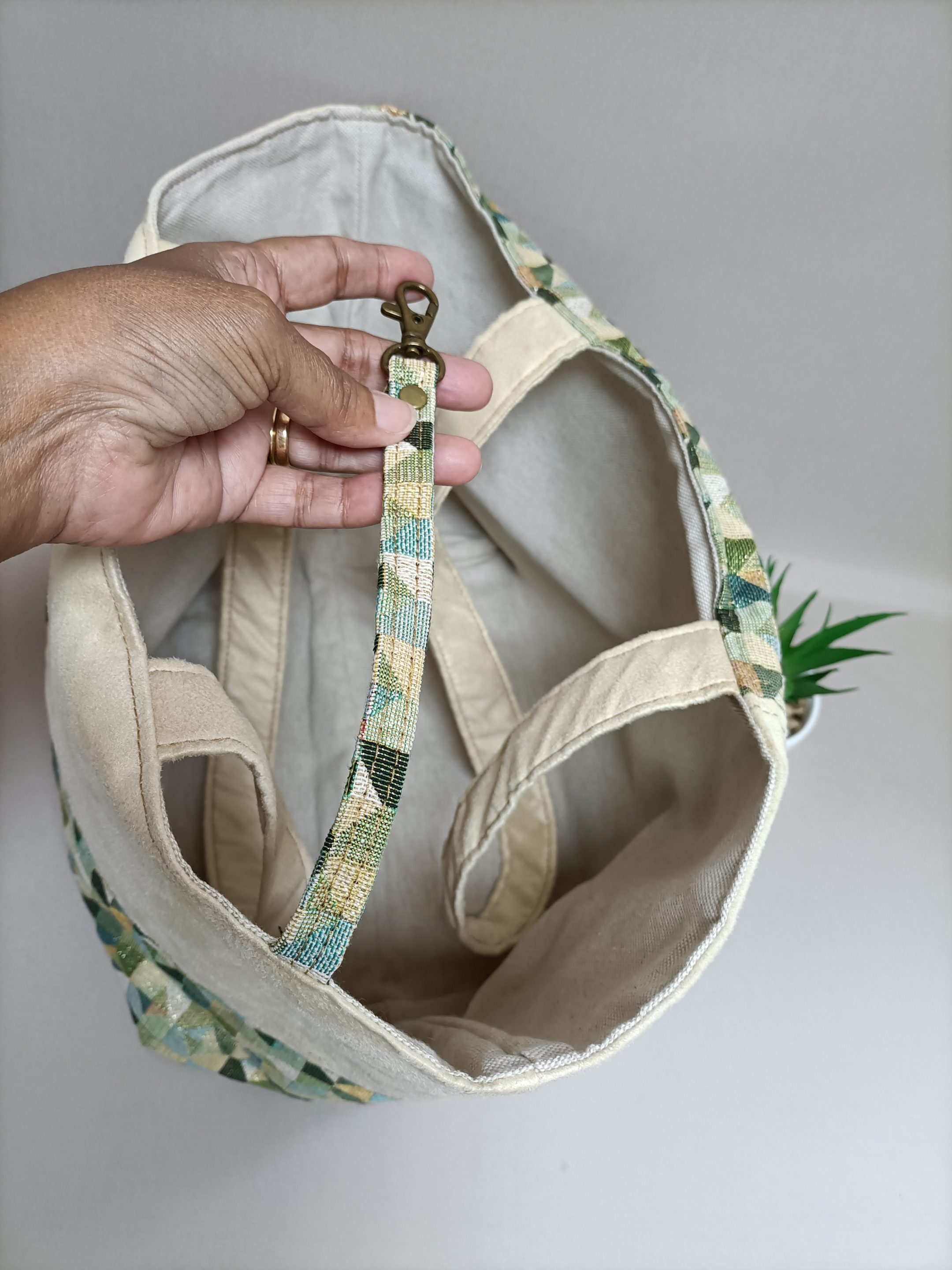 Le sac cabas vert/écru, en tissu jacquard et suédine écru assortie, constitue l’accessoire parfait pour allier style et praticité. Avec ses dimensions généreuses, ce sac vous permet de transporter tout ce dont vous avez besoin au quotidien. Que vous soyez en journée de travail bien remplie ou en sortie entre amis, emmenez-le partout avec vous. Ce sac cabas ne se limite pas à son esthétique séduisante ; il simplifie également votre vie quotidienne. L’un des atouts majeurs de ce sac réside dans son mousqueton intégré, idéalement situé à l’intérieur. Ce mousqueton vous permet d’accrocher vos clés en toute sécurité, vous faisant gagner un temps précieux lorsque vous devez les retrouver rapidement.