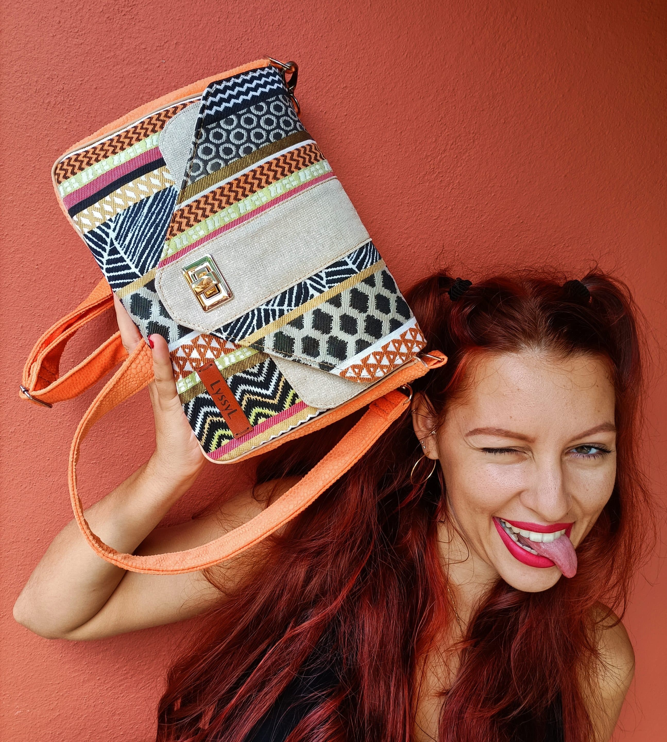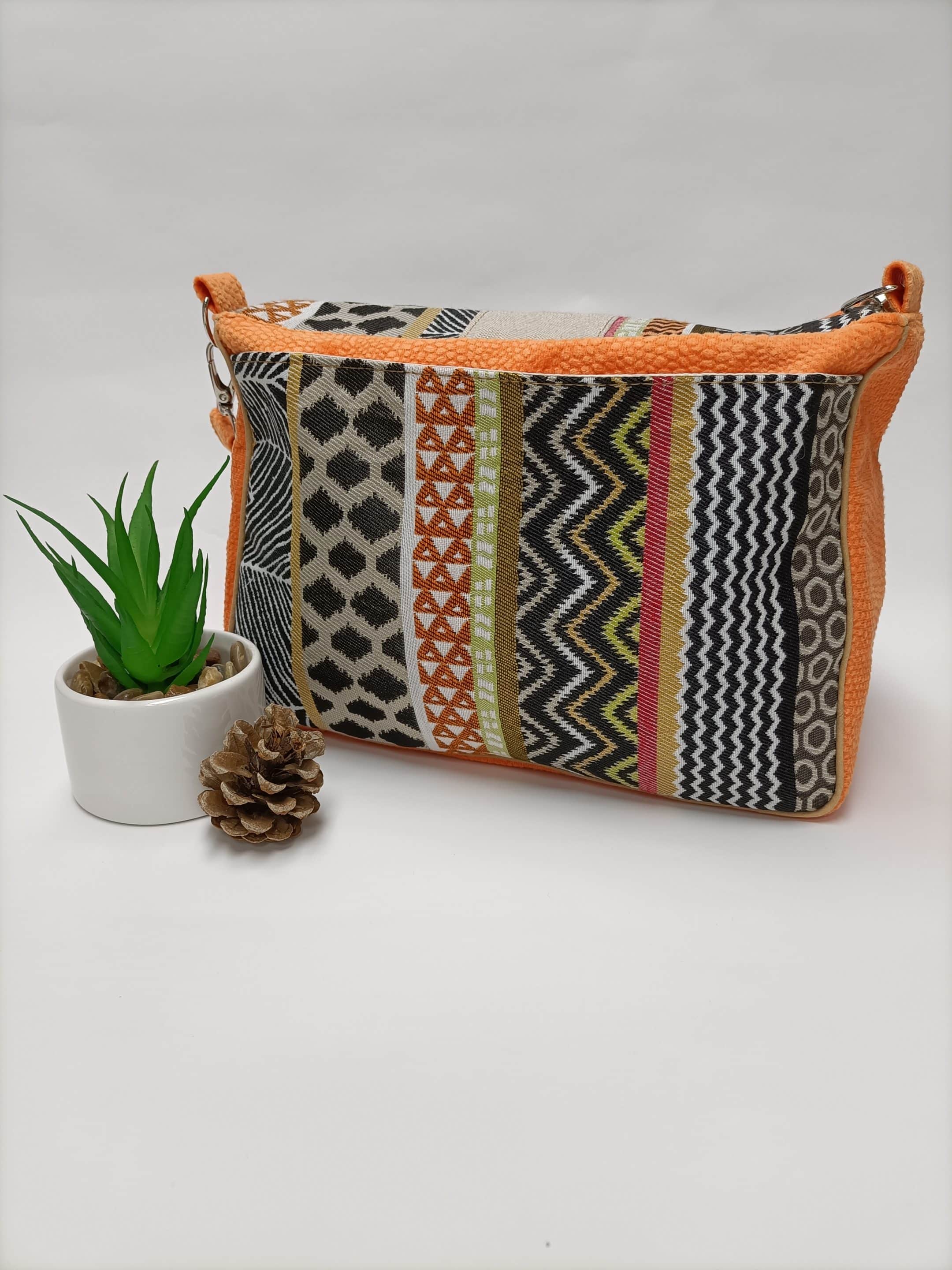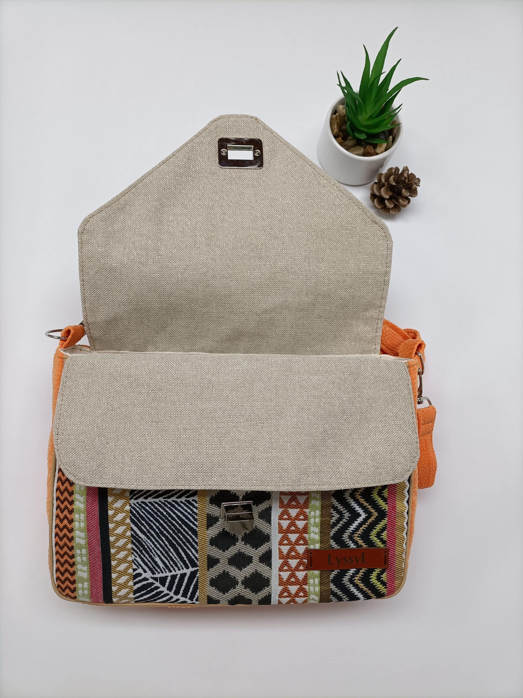 Le sac Focus on Me se présente comme un accessoire de ville chic, parfait pour toutes les occasions. Son corps en jacquard graphique orangé attire immédiatement l’attention. De plus, les rabats en joli coton épais pailleté ajoutent une touche d’élégance. Le fond en suédine orange texturé complète le look avec style.