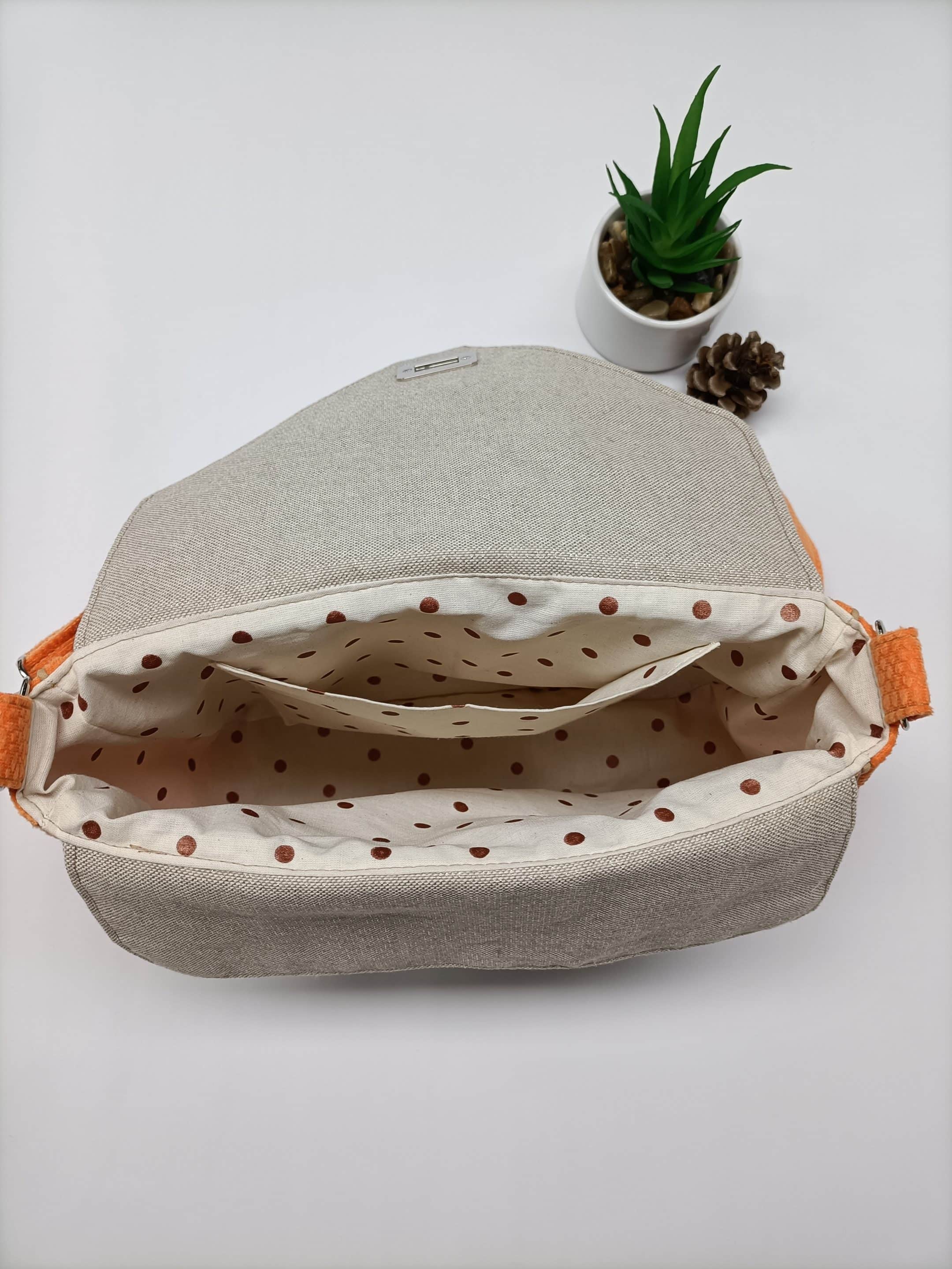 À l’intérieur, le coton à petits poids crée une ambiance agréable. Une poche zippée se trouve dans le grand compartiment, juste sous le rabat principal. Cela permet de garder vos objets en sécurité. En outre, sous le petit rabat, une poche plaquée se cache à l’avant du sac, offrant un accès rapide à vos essentiels. Au dos, une autre poche plaquée se révèle très utile et facile d’accès.